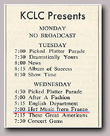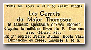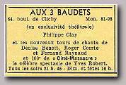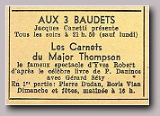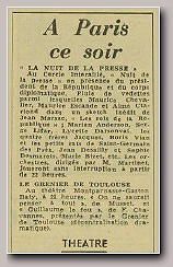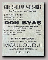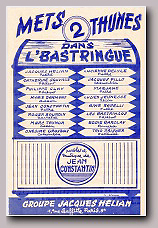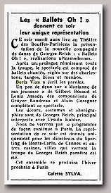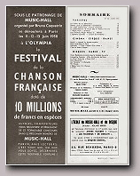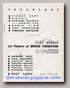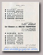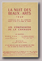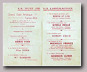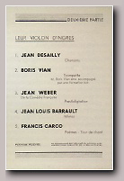 Ouverture du spectacle avec : LE SWINGTETTE DE BORIS VIAN du Hot-Club de France Suivent : Miss DORA Contorsionniste, Mlle DARBANS de l'Opéra cimique, BERTH & LYS Fresques orientales, Gisèle REILLE vedette des disques Olympia, Robert Colin fantaisiste, Michelle FRANCE le rossignol de Paris et la vedette internationale Georges ULMER