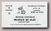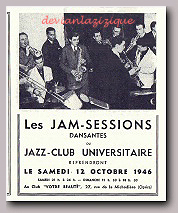 Les Jam-Sessions dansantes du Jazz-Club Universitaire A l'occasion du 10è tournoi des espoirs qui a lieu le 23 Décembre 1946 à la sall Pleyel, l'orchestre du Jazz-Club Universitaire, dirigé par Jackie Vermont°, gagne la Coupe du Hot-Club de France. Les résultats paraissent dans un encadré sur le numéro Spécial de Noël de JAZZ HOT qui porte une photo de Dizzy Gillespie en couverture Sur le numéro suivant (n°12 de Janvier 1947) on apprend que le 5 Janvier a eut lieu un concert dans la Salle de l'Ecole Normale de Musique auquel a participé Boris Vian sous la direction du clarinetiste Claude Abadie Dans cet orchestre figuraient : Hubert Fol au saxo, Boris Vian au cornet, Raymond Jeannet au trombone et la section rythmique composée de d'Halluin, Nawab, Raymond fol et Claude Léon.