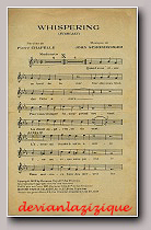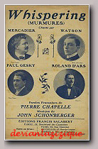 PARTITION WHISPERING (MURMURES) Paroles de Pierre CHAPELLE Musique de John SCHONBERGER EDITIONS FRANCIS SALABERT Paris, 35 Bd des capucines Vente en gros : Paris, 22 rue Chauchat Bruxelles, 13 rue de Loxum E.A.S 1819bis IMP. H. VALLAZ, 18 rue MAZAGRAN - PARIS Envoi franco contre Mandat Prix 0F60 Copyright 1920 by Shermann Clay & C° San Francisco